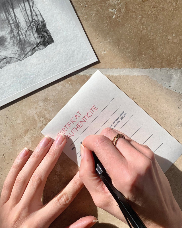 Chaque tirage est entièrement fait main, rendant chaque exemplaire unique. L’image livrée peut ainsi présenter de légères variations par rapport à celle visible en vitrine ou en ligne, soulignant la nature expérimentale et poétique.