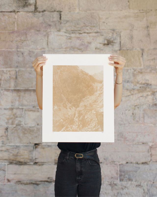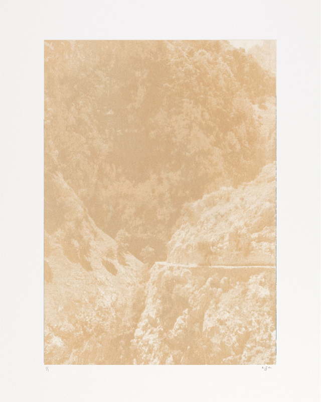 Réalisées en cyanotype duotone à partir de photographies de paysages, ces œuvres interrogent la frontière entre la photographie documentaire et l’illustration suggestive. En brouillant les repères visuels et en réduisant la palette à des tons minéraux, chaque image devient un territoire ouvert, à mi-chemin entre représentation et abstraction.