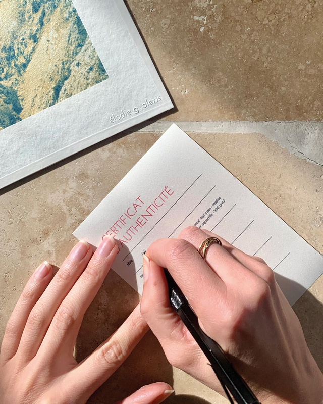 Le procédé du cyanotype duotone — technique photographique ancienne à base de sels de fer — consiste à produire une image par contact sous lumière UV, révélant une gamme de bleus profonds et nuancés. Ainsi, le tirage reçu peut présenter de subtiles différences par rapport à celui visible en vitrine ou à l’écran — chaque image portant la trace du geste et des aléas de la chimie photographique.