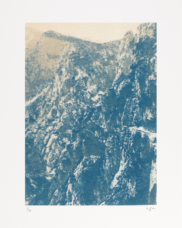 Réalisées en cyanotype duotone à partir de photographies de paysages, ces œuvres interrogent la frontière entre la photographie documentaire et l’illustration suggestive. En brouillant les repères visuels et en réduisant la palette à des tons minéraux, chaque image devient un territoire ouvert, à mi-chemin entre représentation et abstraction.